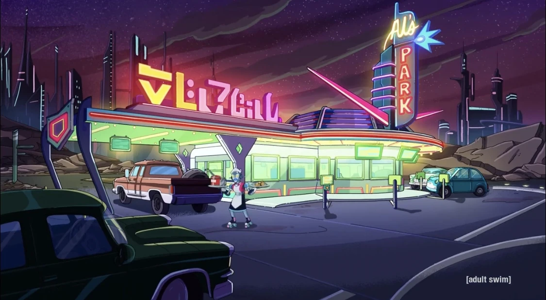 Al's Park is a drive-in fast-food restaurant that uses carhops on roller skates. It first appears in "Amortycan Grickfitti" when Morty, Summer, and Bruce Chutback are taken to the restaurant using the Space Cruiser where they meet a Changformer that wants the spaceship to hang out with him and his friends at a ski resort.