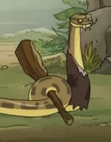 Caveman Snake resembles a normal snake but has white sharp fangs, a huge forehead, and a brown ripped tunic.