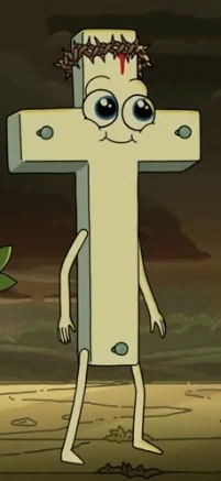 Crossy is first seen with other Bible-themed parody characters congratulating Rick and Morty after praying to Jesus Christ to drain the control panel and stop the Story Train.