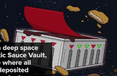 Some of the sauces kept there are: McD Salad Cream, McD Szechuan and McD Spicy Buffalo. The space station is surrounded by what appears to be chicken nuggets.