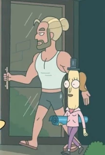 In the episode "How Poopy Got His Poop Back", Mr. Poopybutthole mentions that Guy is a man who teaches pilates to Amy to Rick and his friends at F**k You's. He also mentions how he found this out by hiring Gul'Karna, a Predator private investigator to spy on her since Amy has a restraining order against him.