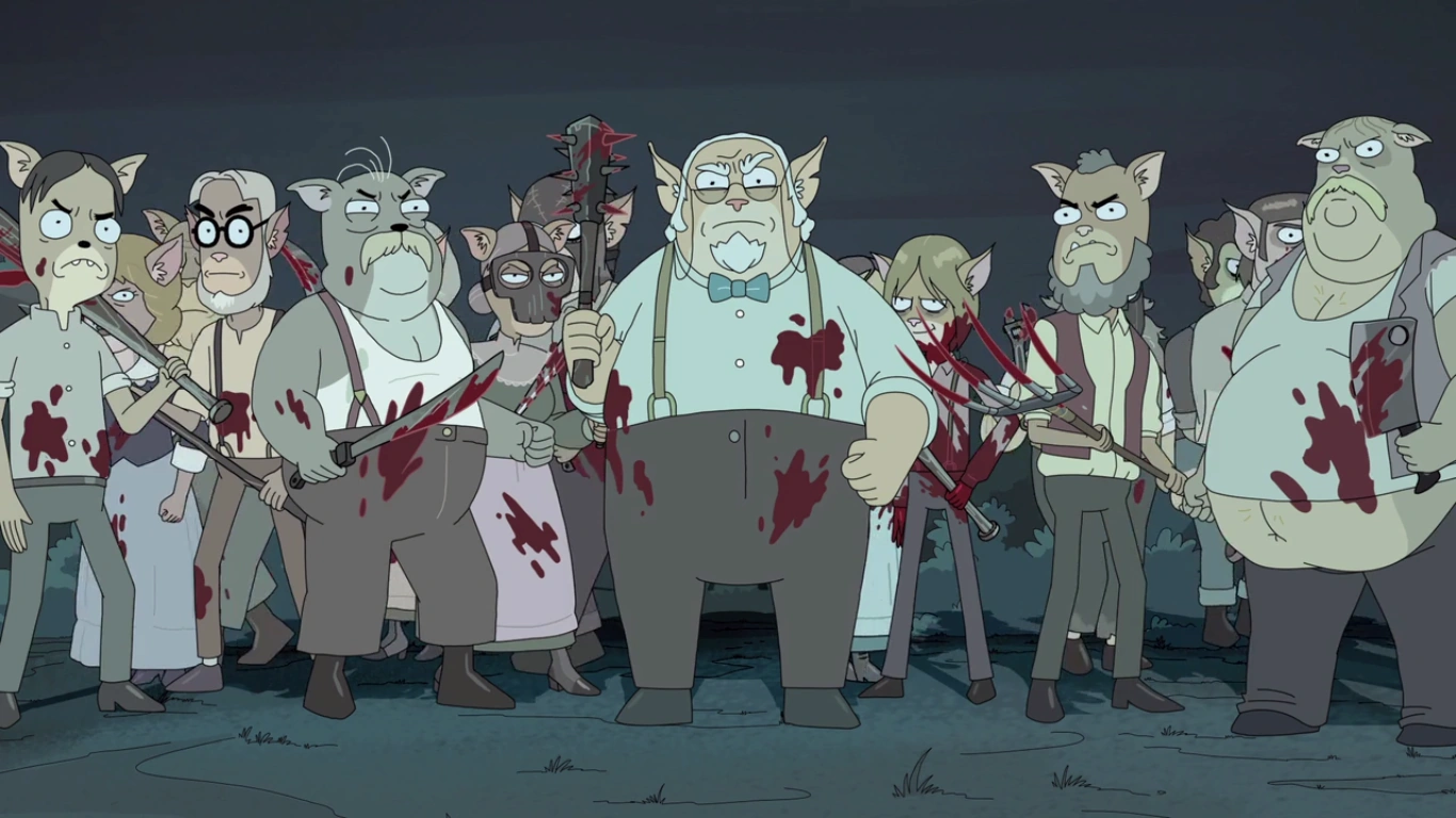 Rick and Arthricia flies into the mansion of the planet's ruler where they shoot everyone inside to take revenge for previous purge festivals and stop them from arranging new purge festivals. After this was done, the inhabitants of the nearby village were without leadership or economic systems. Before they managed to work out a basic trade system, they turned on each other, which resulted in the proposition to host an annual event to let out the murderous anger they all have pent up.