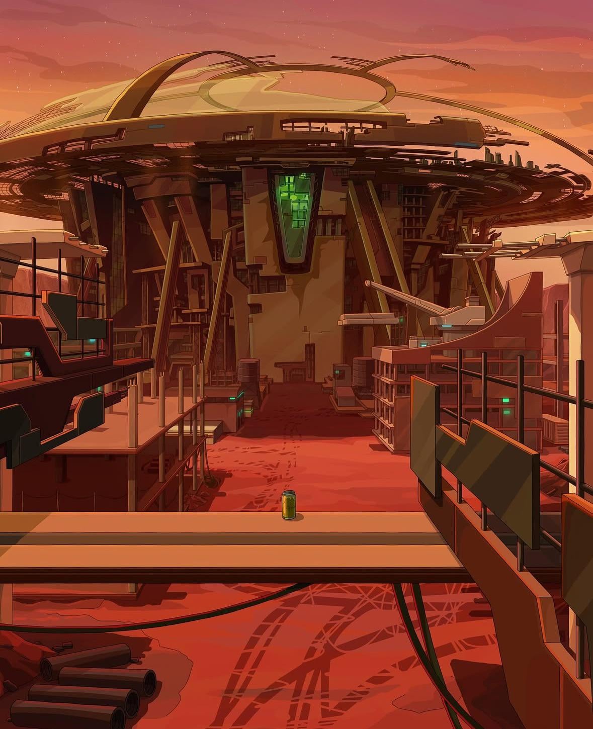 The interior of the Citadel has a mixture of metal structures and natural fauna, with numerous fountains, trees, and distinct curved buildings. Somewhere within the Citadel, a large statue depicting an unspecified Rick sits in a central column. The Citadel contains a mega-city within its structure, with several divisions and districts such as the Mortytown ghetto where the Creepy Morty is located. The city has its own fully-functional economy and infrastructure, consisting of Ricks and Mortys.