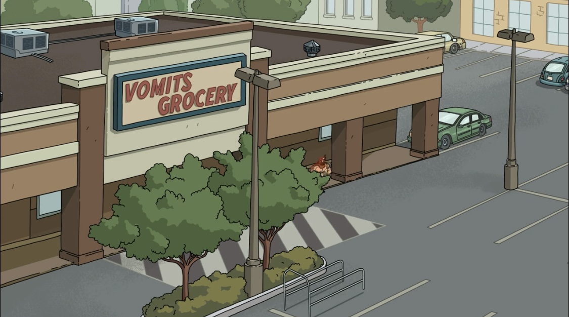 Vomits Grocery is a grocery store, used whenever someone wants to buy food products or other items. It is first seen when Rick and Morty encounter Zick Zack in the parking lot and then later seen when Hephaestus visits the place under the effects of Randotron's orders.